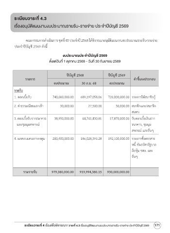 ระเบียบวาระที่ 4 เรื่องเพื่อพิจารณา/ วาระที่ 4.3 เรื่องอนุมัติแผนงานงบประมาณรายรับ-รายจ่าย ประจำาปีบัญชี 2569 171